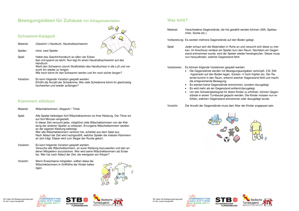 Für alle Eltern, die neue Ideen suchen, wie sie den Bewegungsdrang ihrer Kinder stillen können, haben Kinderturnstiftung BW, BTJ und STB “Bewegungspäckchen” für zu Hause zusammengestellt. Alle Bewegungsanregungen sind mit wenig Material, das jeder Zuhause hat, umsetzbar und bereiten nicht nur den Kleinen zwischen drei und sechs Jahren Spaß. Mit etwas Kreativität lassen sich die Spielideen im Handumdrehen auch für ältere Kinder anpassen. Mit dabei sind Spielideen von “Ich packe meine Sporttasche” über “Farben verbiegen” oder “Insel hüpfen” bis zu “Kuscheltier flieg”. Viel Spaß beim gemeinsamen Spielen und Bewegen! Einfach auf eins der Päckchen klicken und den Anweisungen folgen.