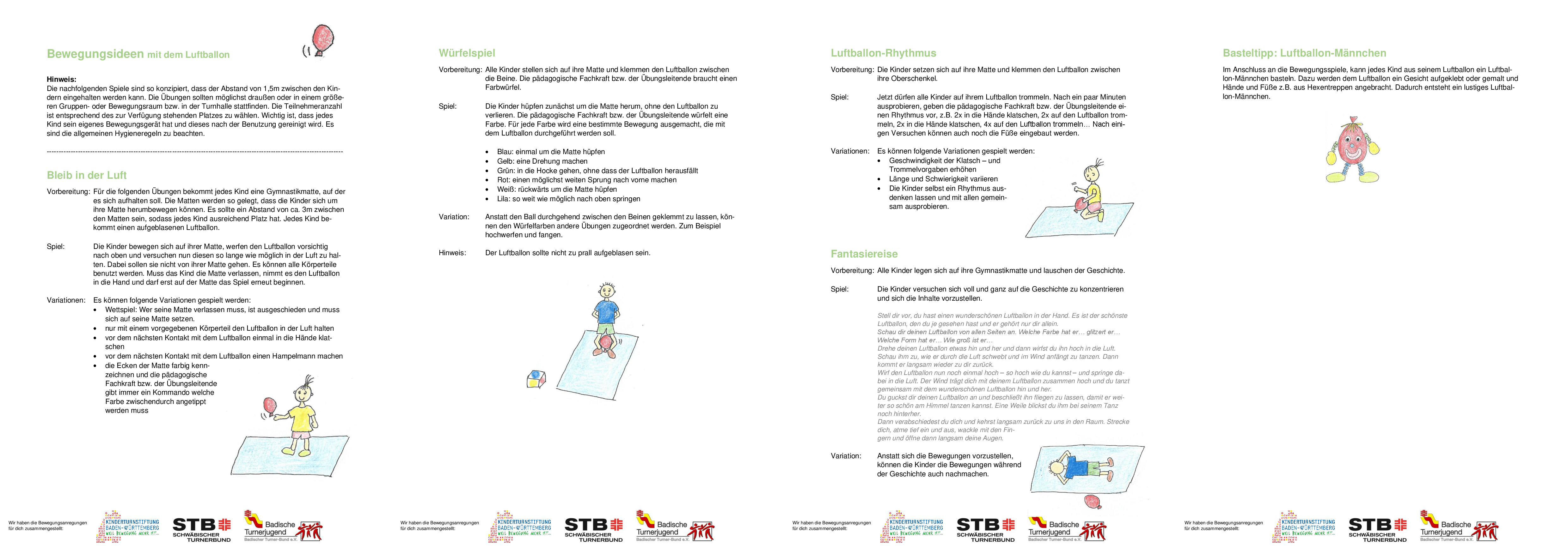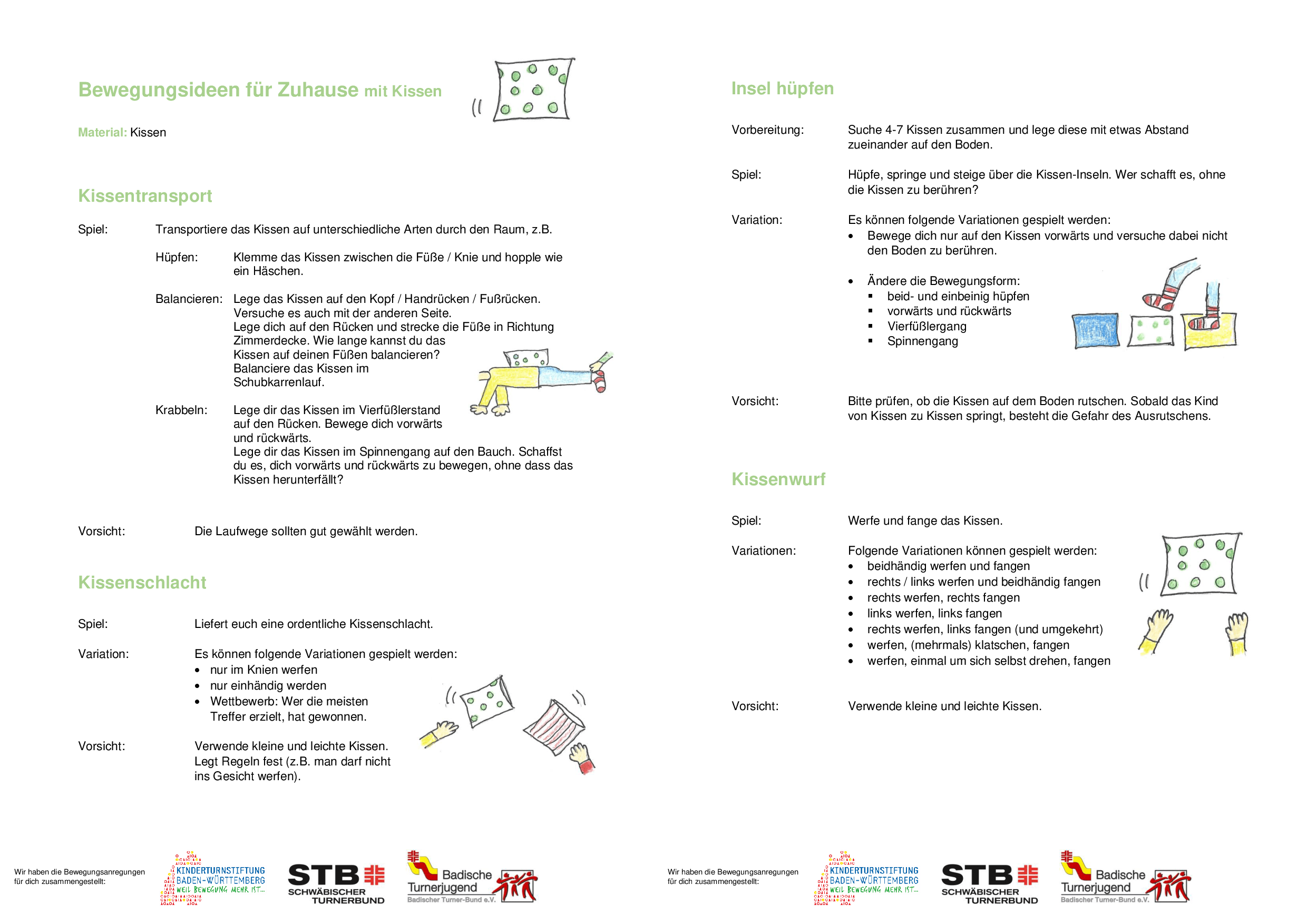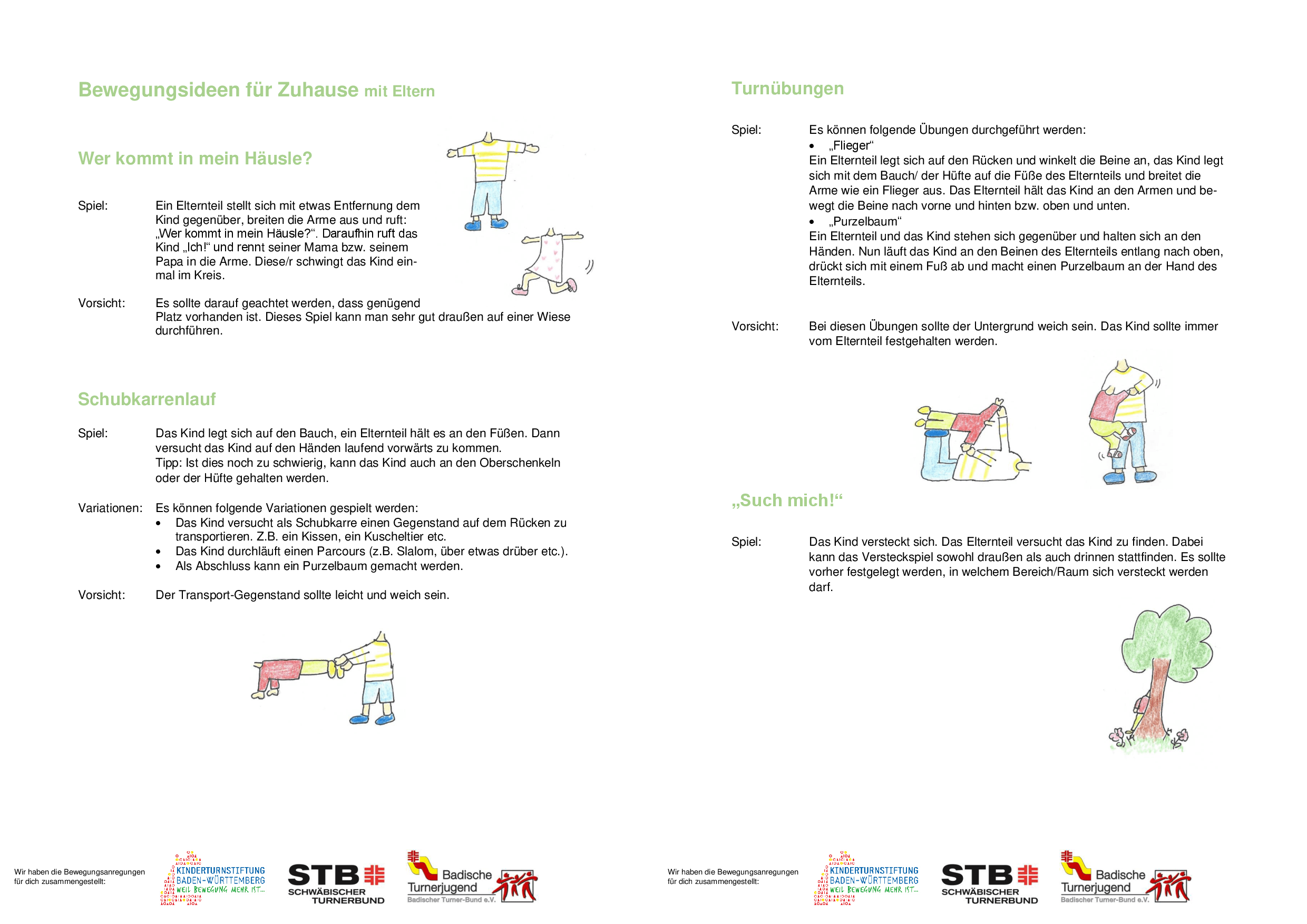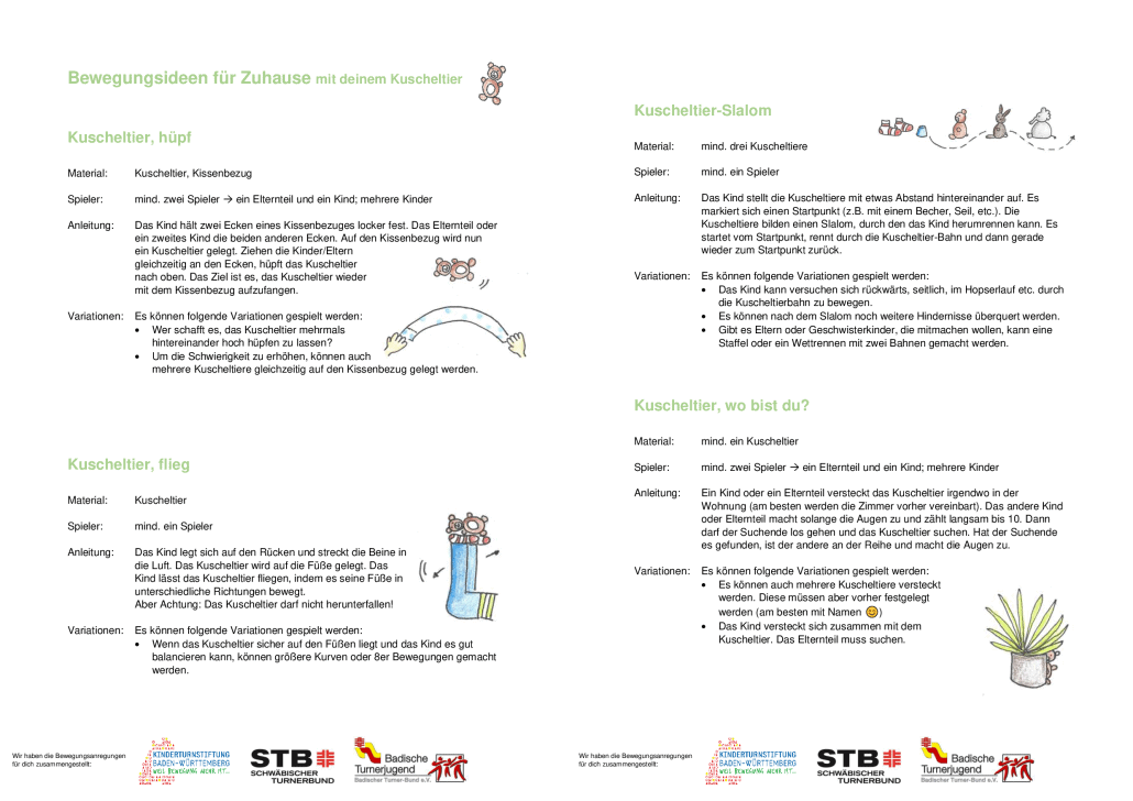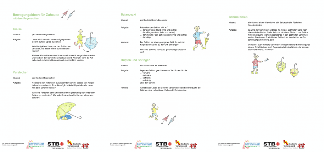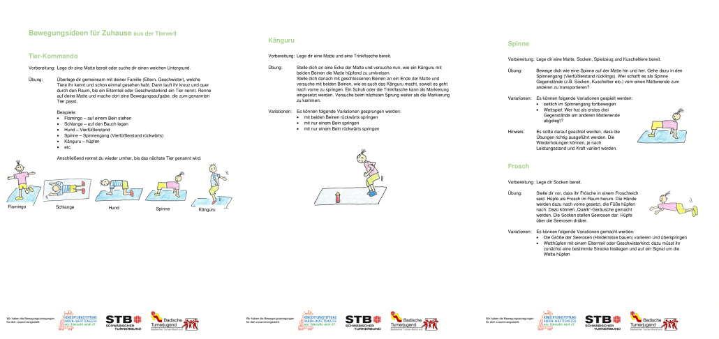 Als kleines Alternativangebot hat der Schwäbischer Turnerbund (STB) verschiedene Angebote entwickelt, um das Kinderturnen ins heimische Wohnzimmer zu verlegen. Beweglichkeit, Geschicklichkeit, Rhythmusgefühl und jede Menge Spaß sind garantiert. Auf den folgenden Bildern findet ihr Anregungen und Übungen, die euch dabei helfen sollen trotzdem Spaß zu haben und fit zu bleiben. Damit seid ihr bestens vorbereitet, wenn es wieder losgeht.
