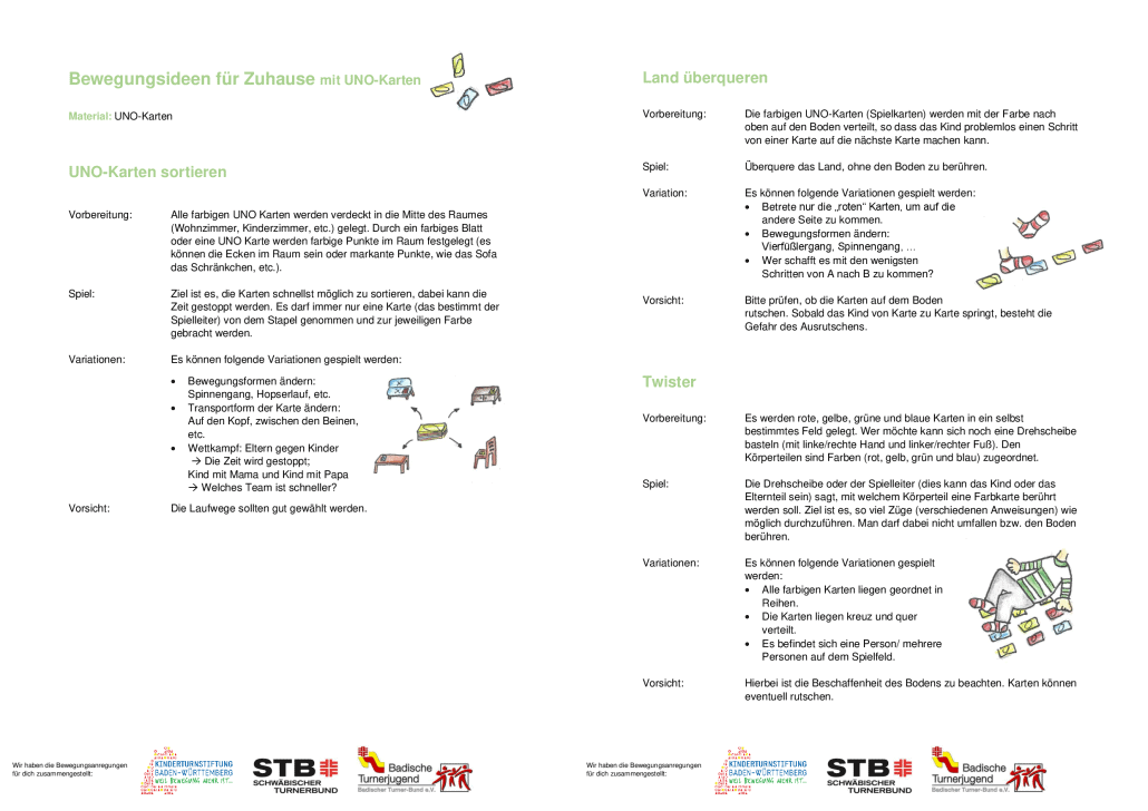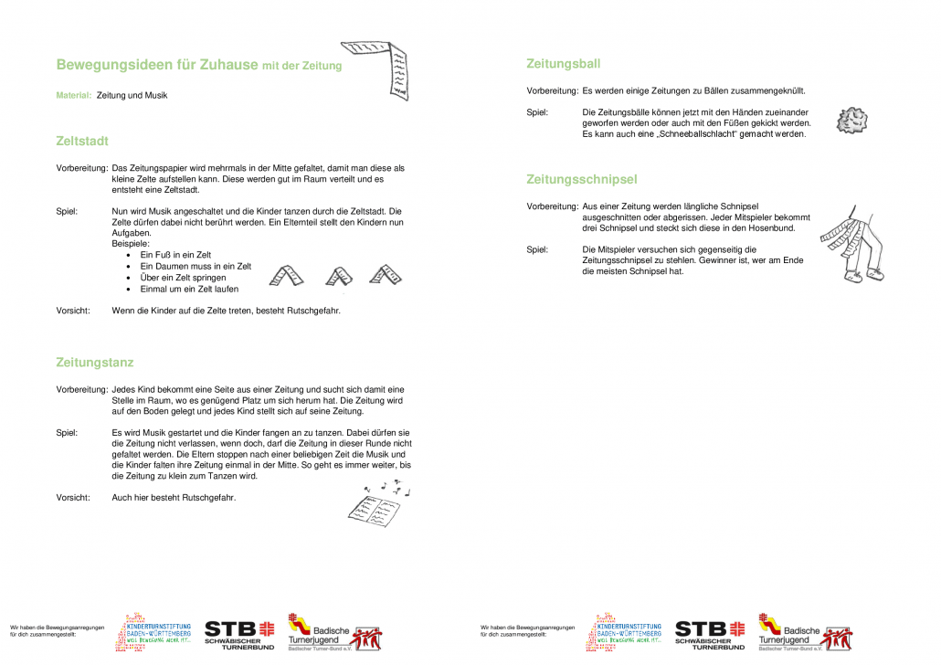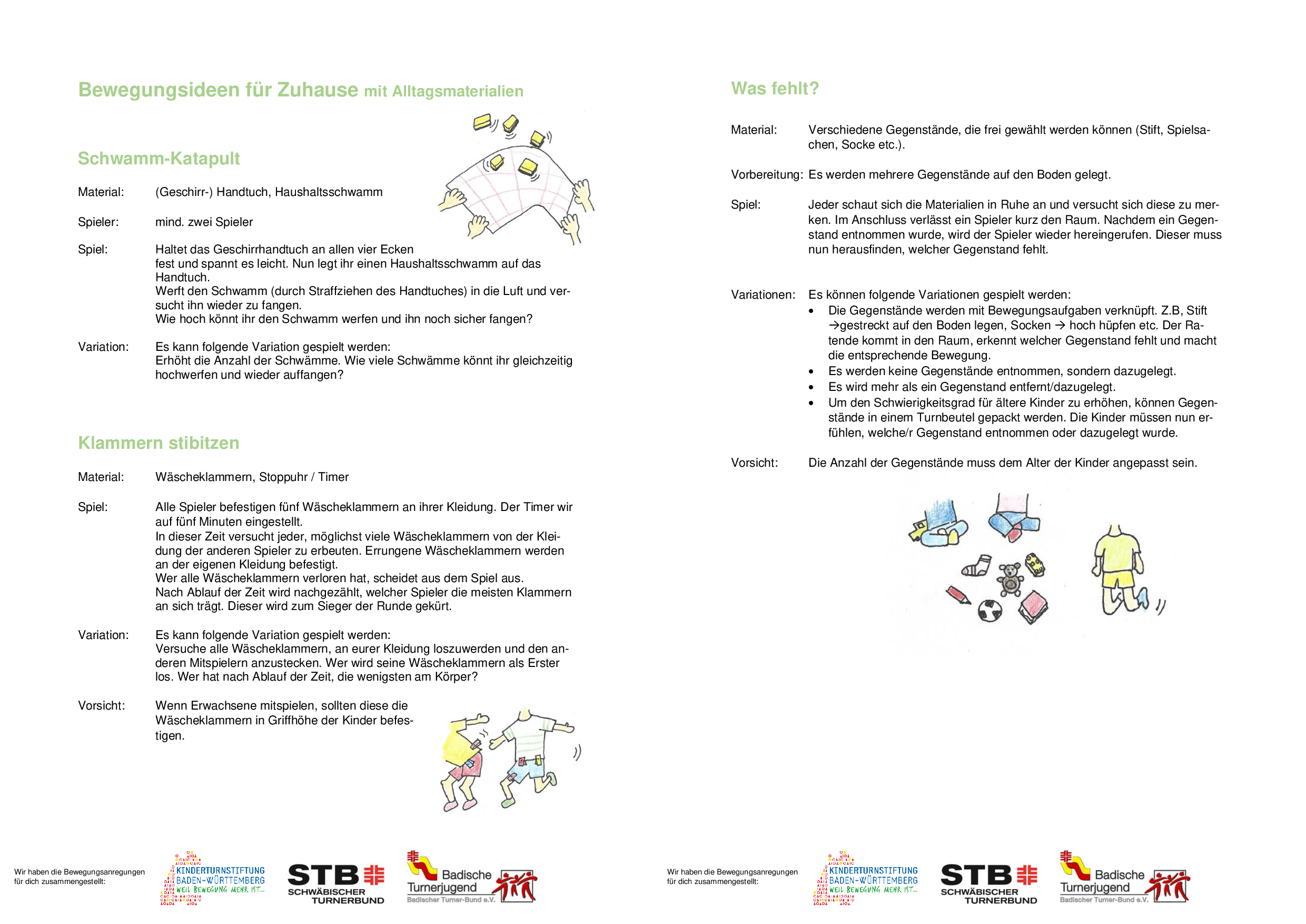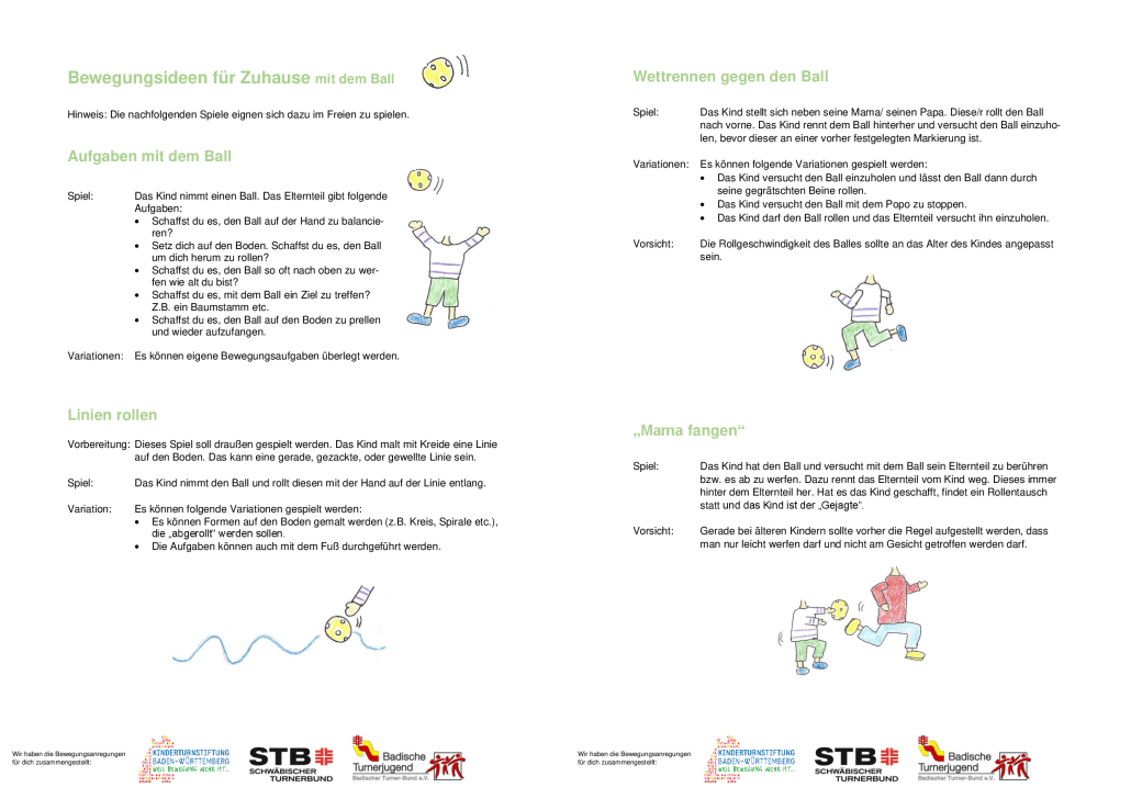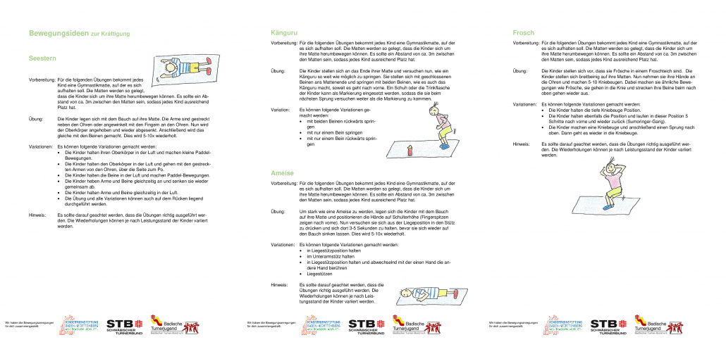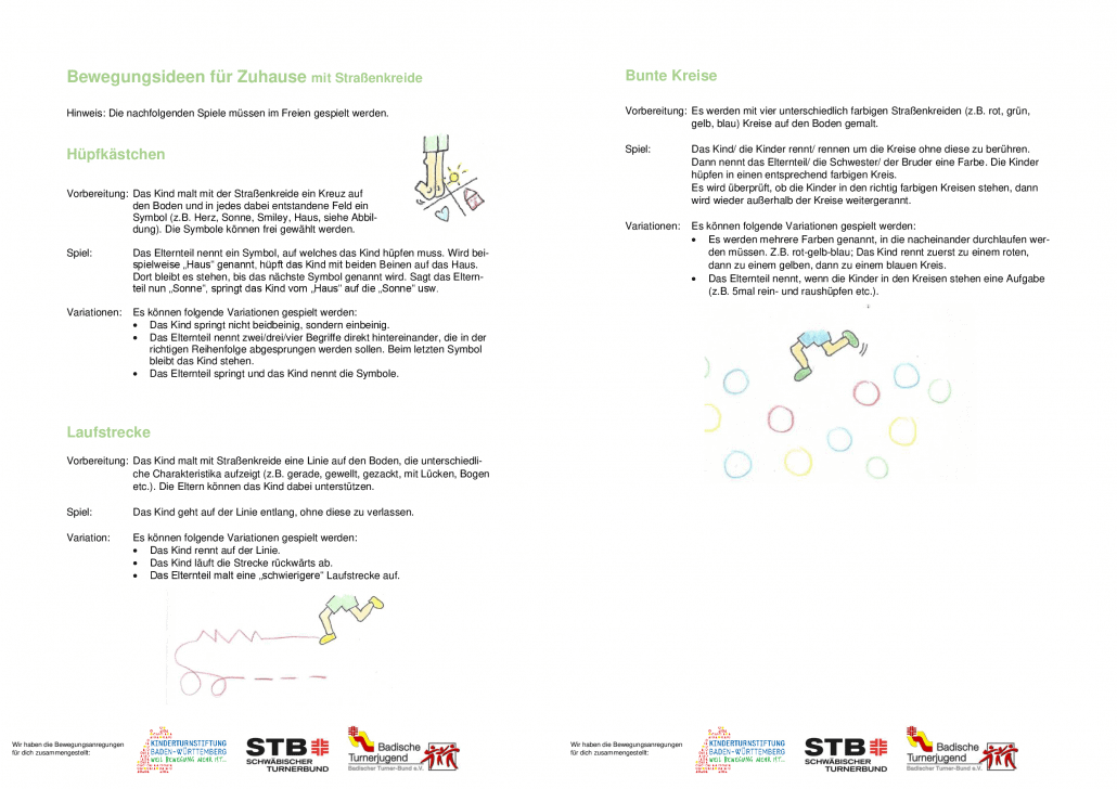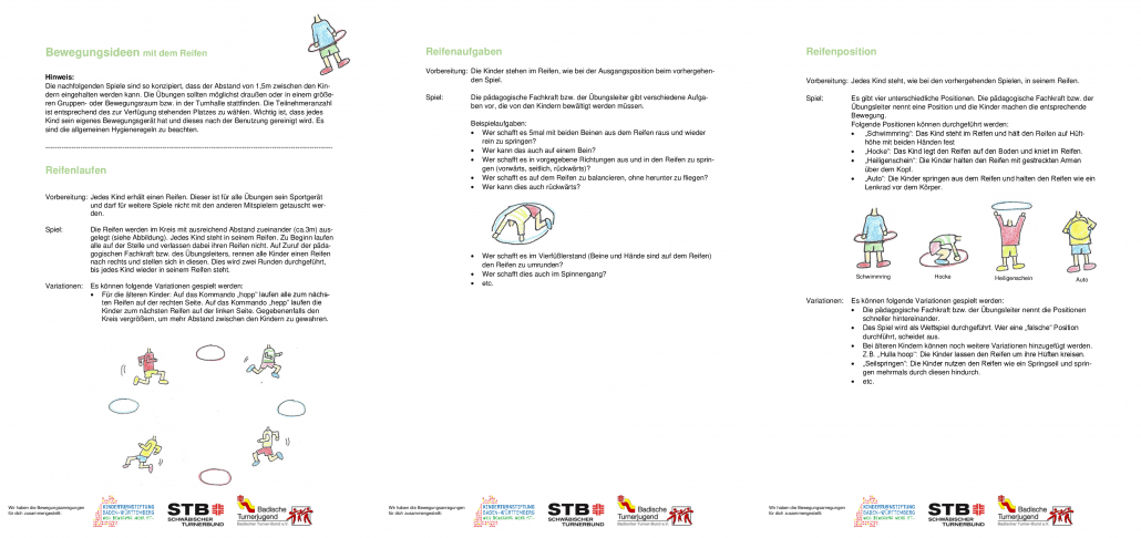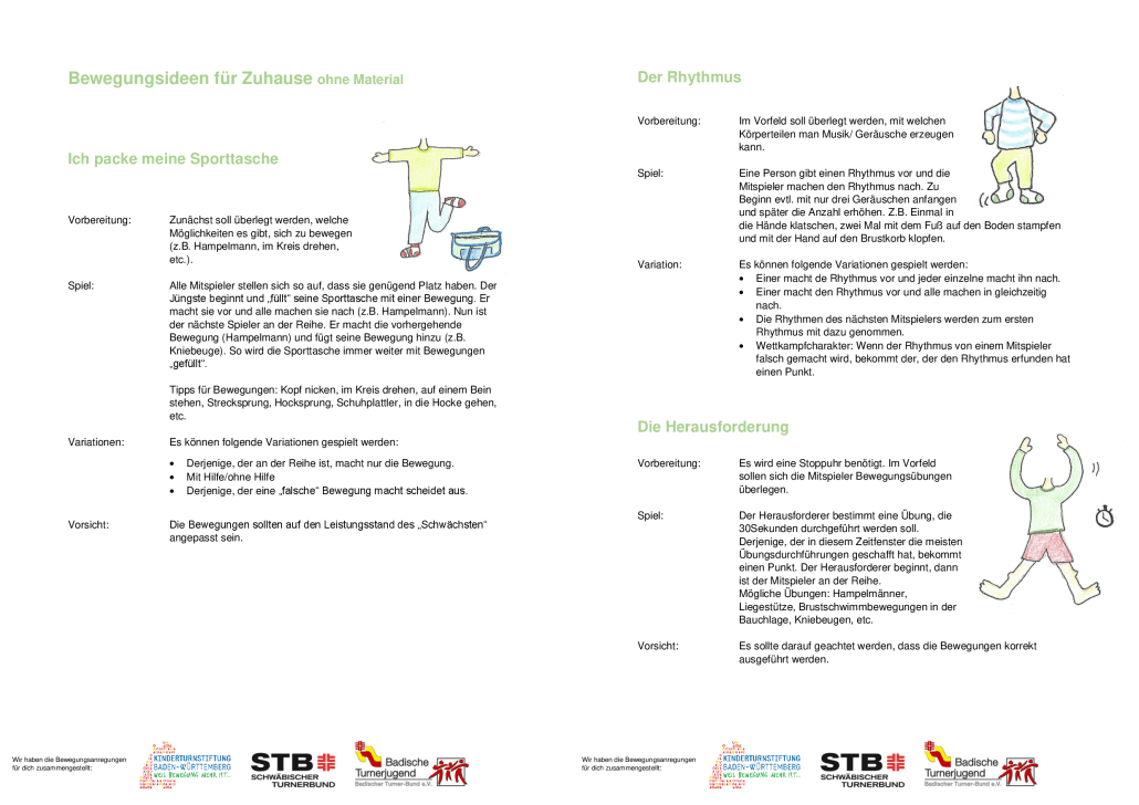 Als kleines Alternativangebot hat der Schwäbischer Turnerbund (STB) verschiedene Angebote entwickelt, um das Kinderturnen ins heimische Wohnzimmer zu verlegen. Beweglichkeit, Geschicklichkeit, Rhythmusgefühl und jede Menge Spaß sind garantiert. Auf den folgenden Bildern findet ihr Anregungen und Übungen, die euch dabei helfen sollen trotzdem Spaß zu haben und fit zu bleiben. Damit seid ihr bestens vorbereitet, wenn es wieder losgeht.