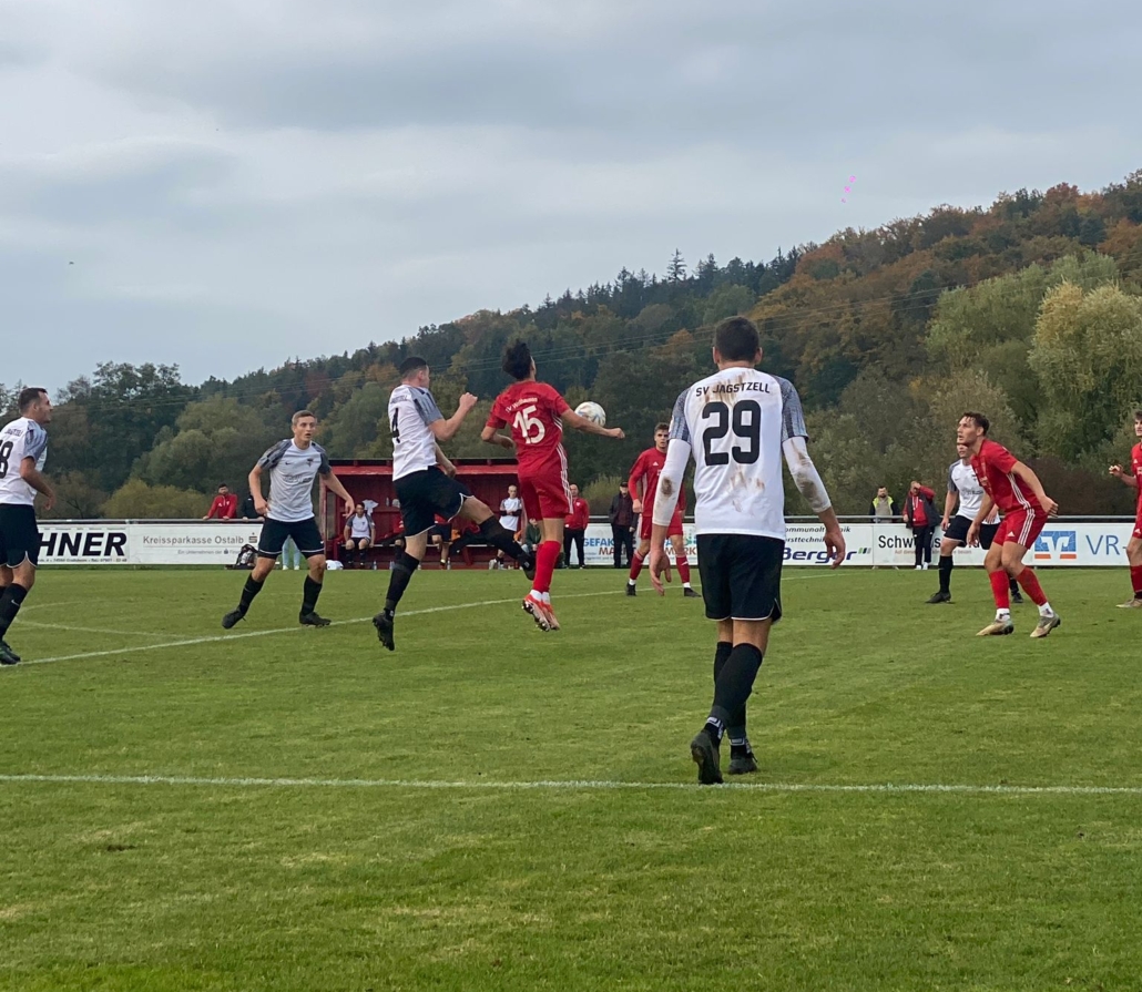 In der zweiten Halbzeit drängte der SV Jagstzell mit mehr Entschlossenheit nach vorne, um nicht den nächsten ärgerlichen Punktverlust einbüßen zu müssen. Dennoch tat man sich weiterhin schwer Räume zu finden, die das Bollwerk knacken könnten. So bot sich nach einem Eckball die faustdicke Gelegenheit. Timo Ziegler, der in einer ungünstigen Schussposition war legte nochmal quer auf Axel Probst, woraufhin der Abschluss in höchster Not noch geklärt werden konnte. Das Spiel wurde zunehmend hitziger und wilder, sodass aufgrund vieler Unterbrechungen kein wirklicher Spielfluss zustande kam. Diesen Rhythmus nahmen die präsenten Gäste besser auf und konnten nach einer langen Phase ohne Torabschluss prompt wieder gefährlich werden. In der 70ten Spielminute spielten diese einen Konter erneut sauber aus, sodass für Philipp Gschwender im Tor keine Abwehrchance blieb. Die Entscheidung in der Partie wurde dann nur 4 Minuten darauf geliefert. Nachdem ein zu kurz geratener Rückpass von Leon Runge gnadenlos abgelaufen werden konnte, musste der vierte Gegentreffer hingenommen werden. Lediglich Ergebniskosmetik war in der 86ten Minute noch möglich, in welcher Bryan Schönberger den Torhüter per sehenswertem Heber außer Gefecht setzte. Ganz bitter wurde es noch für den SVJ, da der formstarke Christian Vaas im Anschluss noch die Rote Karte kassierte und somit die kommenden Spiele gesperrt verpassen wird. Damit verlor man nicht unverdient mit 2:4.