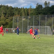 Um diesen Ansprüchen gerecht zu werden, startete der SV Jagstzell zunächst sehr ausgeglichen in die Partie, um in den richtigen Aktionen eiskalt zuzuschlagen. Daher herrschte für die Zöbinger eine Grundgefahr durch die Jagstzeller Offensivleute vor, welche sich nicht allzu leicht stoppen ließ. Dennoch schafften es auch die Gäste erste Impulse in der Offensive zu setzen, welche zunehmend über lange Bälle in die Spitze zustande kamen. Erstmals so richtig gefährlich wurde es dann allerdings vor dem Tor des FSV, da Jonathan Erhard nach einem Steckball nur durch ein Foul im Sechzehner zu stoppen war. Der fällige Strafstoß wurde von Max Rettenmeier in der 15ten Spielminute ausgeführt und durch ein bisschen Glück auch erfolgreich verwertet. Dieser Führungstreffer verlieh Jagstzell allerdings nicht lange den erhofften Rückenwind, da man nur 5 Minuten darauf schon den Ausgleich schlucken musste. Dabei wurde ein scharf getretener Eckball unzureichend verteidigt, sodass ein Zöbinger Spieler freie Sicht und unbedrängt abschließen konnte. Im Anschluss war das Spiel geprägt durch viele Zweikämpfe im Mittelfeld und kontrolliertem Verschieben mit und gegen den Ball. In dieser Phase blieb der SVJ allerdings die gefährlichere Mannschaft und hatte noch die Möglichkeit entweder über Timo Ziegler oder Leon Runge die Führung erneut herzustellen. Jagstzell blieb aber geduldig und kam zum erlösenden Führungstreffer in der Nachspielzeit. Hierfür konnte der Ball über mehrere Stationen auf die rechte Außenbahn befördert werden. Auslöser war ein fantastischer Steckball von Stefan Kucher auf den durchstartenden Jonathan Erhard, wobei letzterer im Strafraum dann Max Rettenmeier bediente, welcher nur noch einzuschieben brauchte.