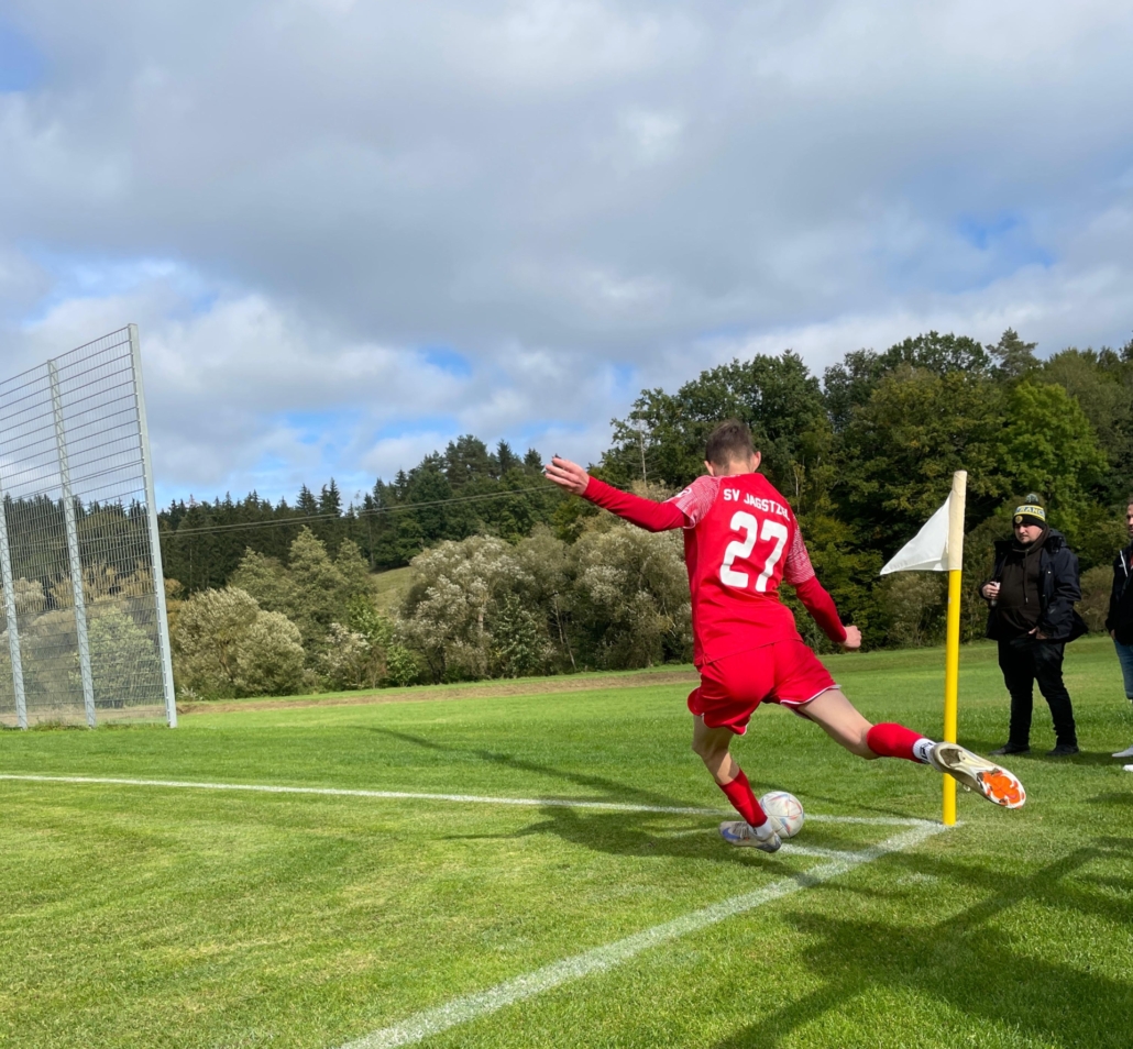 Zu Beginn der Partie nahm der SVJ gleich Fahrt auf und nahm sich die selbst gesteckten Erwartungen zu Herzen. So schaffte man es die Gäste in ihre eigene Hälfte zu pressen, um sich Torchancen zu erarbeiten. Nur 4 Minuten mussten die angetroffenen Zuschauer warten, bis es zum erhofften Torerfolg kam. Nachdem eine Ecke von Jagstzell schnell ausgeführt wurde, kam Max Rettenmeier zum Abschluss. Diesen konnten die Gäste unzureichend blocken, sodass Philipp Wunder aufmerksam agierte und per Abstauber treffen konnte. Anschließend blieb der SVJ die präsentere und druckvollere Mannschaft, was weitere Torchancen mit sich brachte. Dabei befand man sich in Schlagdistanz, um die Führung auszubauen, wobei die erwünschte Raffinesse fehlte, um die Chancen auch in Tore umzumünzen. Daraufhin verflachte das Spielgeschehen ein wenig, sodass beide Mannschaften es darauf anlegten mit sicherer Defensivarbeit gegen mögliche Gegentreffer entgegenzuwirken. Jedoch drohte dann kurz vor dem Halbzeitpfiff das Bollwerk der Jagstzeller Hintermannschaft zu brechen. Eine Flanke der Gäste wurde beim Klärungsversuch unglücklich weitergeleitet, sodass Keeper Daniel Krauss sehenswert einzugreifen hatte. Daraufhin folgte dann auch der Halbzeitpfiff.