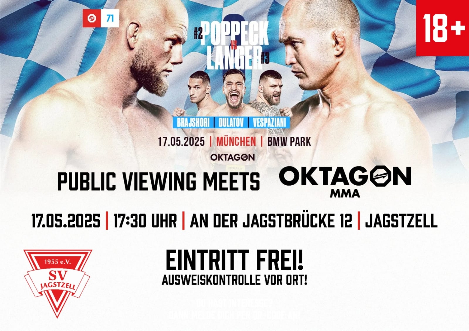 Am Samstag, den 17.05. steht das nächste Oktagon an – und unsere Abteilung Kickboxen hat auch dieses Mal ein Public Viewing in der Jagstaue für euch organisiert. Los gehts ab 17:30, für das leibliche Wohl ist natürlich wieder bestens gesorgt.