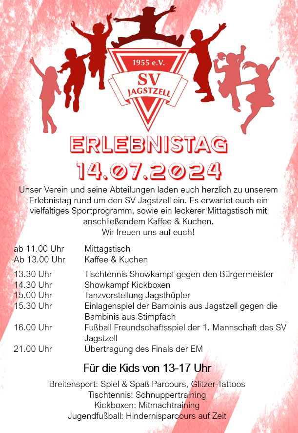 Auch in diesem Jahr möchten wir euch herzlich zum Erlebnistag rund um den SV Jagstzell am 14. Juli einladen. Neben einem vielfältigen Programm mit vielen Mitmach-Stationen ist natürlich auch für eure Verpflegung bestens gesorgt.
